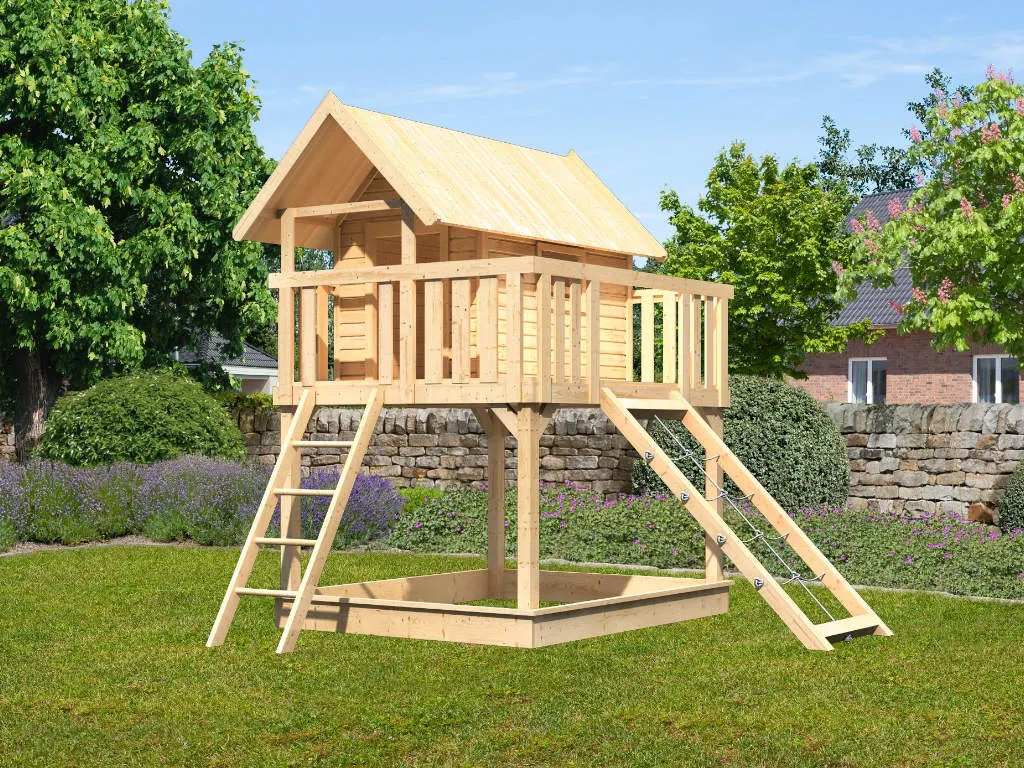 Dieses Spielhaus bietet deinem Kind ein eigenes Reich in erwachsenenfreier Zone. Das Häuschen steht auf Stelzen – um hoch hinauszukommen, ist kindlicher Bewegungseifer gefragt. Stelzenhäuser sind die sichere, stabile Alternative zum Baumhaus und der perfekte Ort für geheime Clubtreffen. Mit einer Grundfläche von 4,81 m² lässt es sich hier wunderbar spielen und toben. Die Wandstärke von 19 mm sorgt für Stabilität.