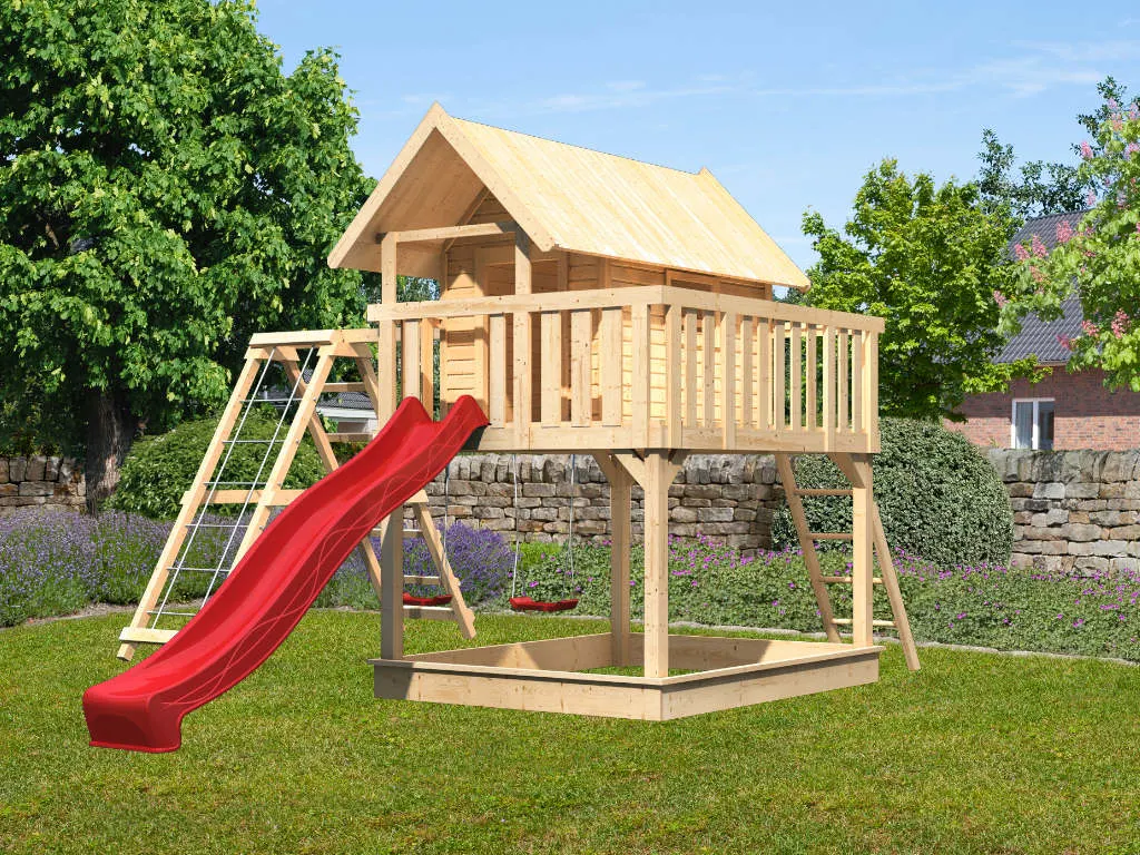 Nicht für Kinder unter 3 Jahren geeignet. Geeignet für Kinder von 3 bis 14 Jahren. Benutzung nur unter unmittelbarer Aufsicht von Erwachsenen. Stolper- und/oder Sturzgefahr. Nur für den häuslichen, privaten Bereich (DIN EN 71-8). Ausschließlich für die Verwendung im Freien. Spieltürme/Stelzenhäuser mit einer Spielhöhe von über 60 cm müssen auf einer weichen Unterlage wie Gras oder Holzspänen aufgestellt werden. Bei Spieltürmen/Stelzenhäusern mit einer Spielhöhe unter 60 cm wird eine weiche Unterlage ebenfalls empfohlen. Die Grundkonstruktion ist in regelmäßigen Abständen auf etwaige Beschädigung und Fäulnisbefall zu kontrollieren. Um die Stabilität zu gewährleisten, müssen die Pfosten im Boden verankert werden. Die Schraubverbindungen sind in regelmäßigen Abständen (ca. 4 Wochen, je nach Benutzungshäufigkeit und Alter des Spielgerätes) auf festen Sitz und Stabilität zu überprüfen. Die angegebenen Maße können geringfügig abweichen.