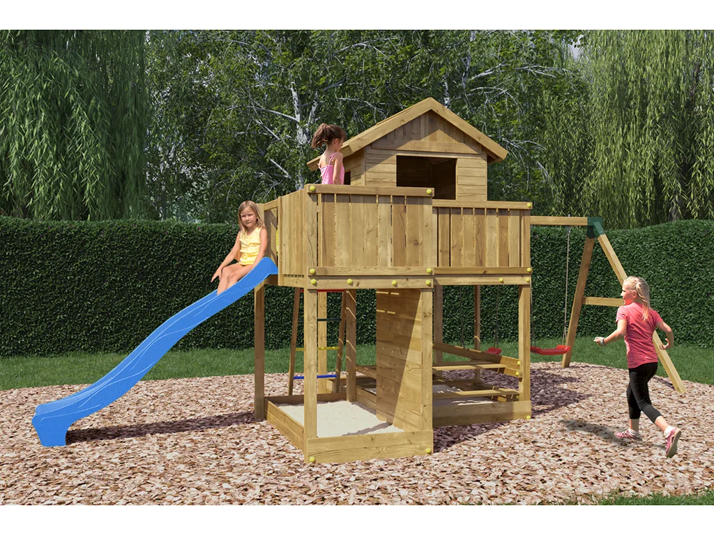 Die Podesthöhe von 125 cm ermöglicht einen tollen Blick über den Garten und die Nachbarschaft. Die zusätzlichen Erweiterungen wie Doppelschaukel, Spielhaus, Sandkasten und Kletterwand bieten vielfältige Spielmöglichkeiten für Kinder jeden Alters.