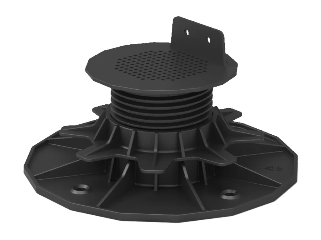 Dieser Kunststoffstellfuß mit einem Verstellbereich von 50–80 mm passt sich präzise den Anforderungen des Geländes sowie des Untergrundes an und lässt sich auch gut bei einer Hanglage oder kleinen Bodenunebenheiten einsetzen. Selbst unter Belastung sind die Träger noch verstellbar. Höchst robust und langlebig hält der Stellfuß Umwelt- und Witterungseinflüssen stand. Die Auflagefläche des abgerundeten Tellerbodens von 20 cm Ø verhindert, dass er in den Untergrund gedrückt wird. Integrierte Stege lassen Wasser abfließen und verhindern Staunässe. Seitliche Lastenverteiler sorgen für eine gleichmäßige Verteilung des Gewichts auf die gesamte Fläche des Standfußes. Pro m² werden ca. 5 Stellfüße benötigt. Einfach, schnell, ohne Vorarbeit und ohne Werkzeug montierbar!
