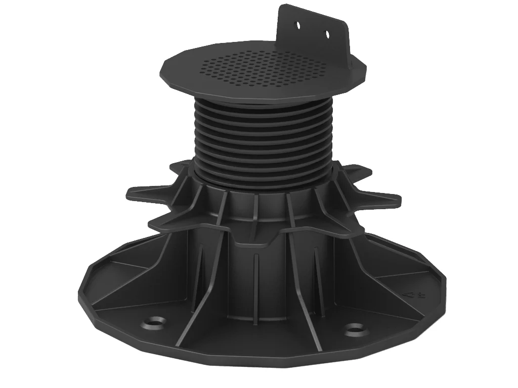 Dieser Kunststoffstellfuß mit einem Verstellbereich von 80–130 mm passt sich präzise den Anforderungen des Geländes sowie des Untergrundes an und lässt sich auch gut bei einer Hanglage oder kleinen Bodenunebenheiten einsetzen. Selbst unter Belastung sind die Träger noch verstellbar. Höchst robust und langlebig hält der Stellfuß Umwelt- und Witterungseinflüssen stand. Die Auflagefläche des abgerundeten Tellerbodens von 20 cm Ø verhindert, dass er in den Untergrund gedrückt wird. Integrierte Stege lassen Wasser abfließen und verhindern Staunässe. Seitliche Lastenverteiler sorgen für eine gleichmäßige Verteilung des Gewichts auf die gesamte Fläche des Standfußes. Pro m² werden ca. 5 Stellfüße benötigt. Einfach, schnell, ohne Vorarbeit und ohne Werkzeug montierbar!