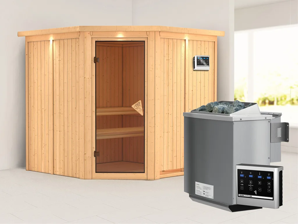 Bei dieser Innensauna ist ein Saunaofen mit einer externen Steuerung inklusive. Das Steuergerät wird außerhalb der Sauna angebracht. Auf diese Weise fängt schon vor dem Saunieren der Komfort an – mit einer bequemen Bedienung von außen und einer noch exakteren Temperatureinstellung. Weitere elektrische Geräte, wie die Kabinenbeleuchtung, können ebenso an die externe Steuerung angeschlossen und bedient werden.