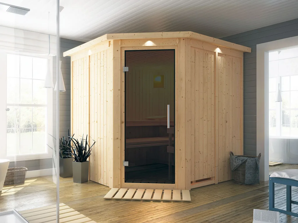 Bei der Montage einer Sauna muss ein Mindestabstand von 10 cm zu Wänden und Decke unbedingt eingehalten werden, um gute Luftzirkulation zu gewährleisten. So kann feucht-warme Luft besser abziehen. In diesem Zusammenhang müssen die Mindestraumhöhe und -breite beachtet werden.