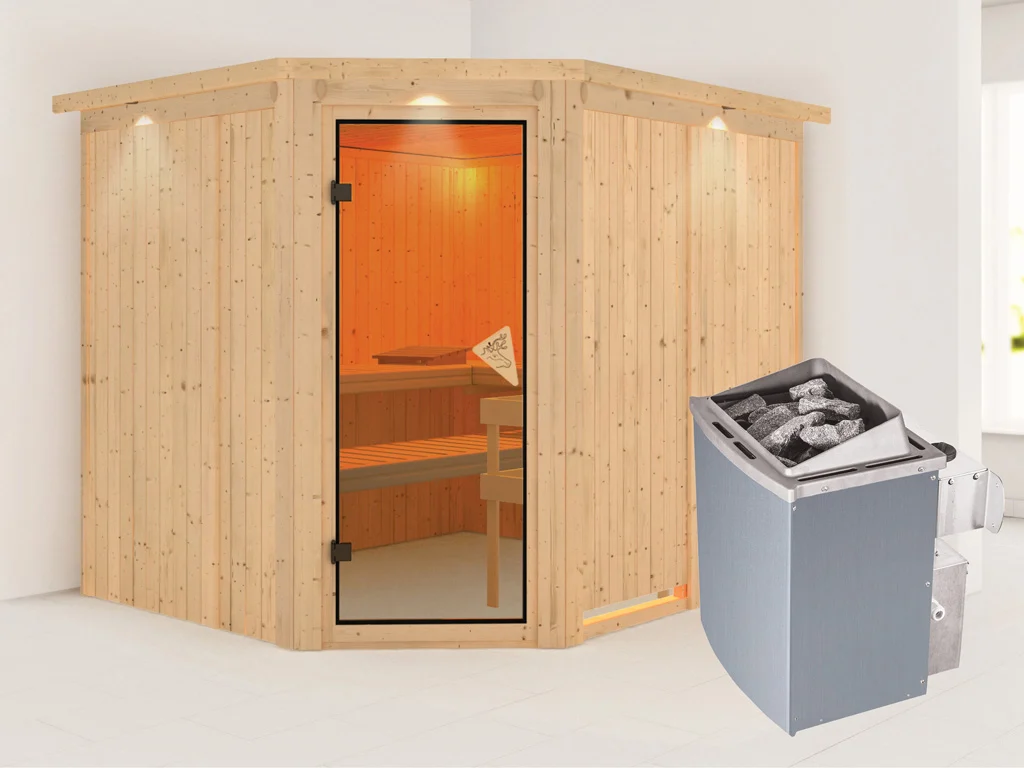 3 Liegen, Ofenschutzgitter aus stabilem Fichtenholz, 3 Liegen, 1 Kopfstütze aus Espenholz, 9 kW Ofen mit integrierter Steuerung , Dachkranz inkl. 3 LED-Strahlern á 7, 5 Watt, Montageanleitung.