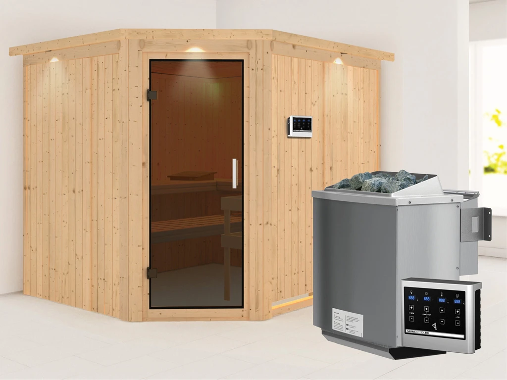 3 Liegen, Kopfstütze, 9 kW Bio-Kombiofen, ext. Steuerung, Ofenschutzgitter aus stabilem Fichtenholz, Dachkranz inkl. 3 LED-Strahlern á 7, 5 Watt, Montageanleitung.