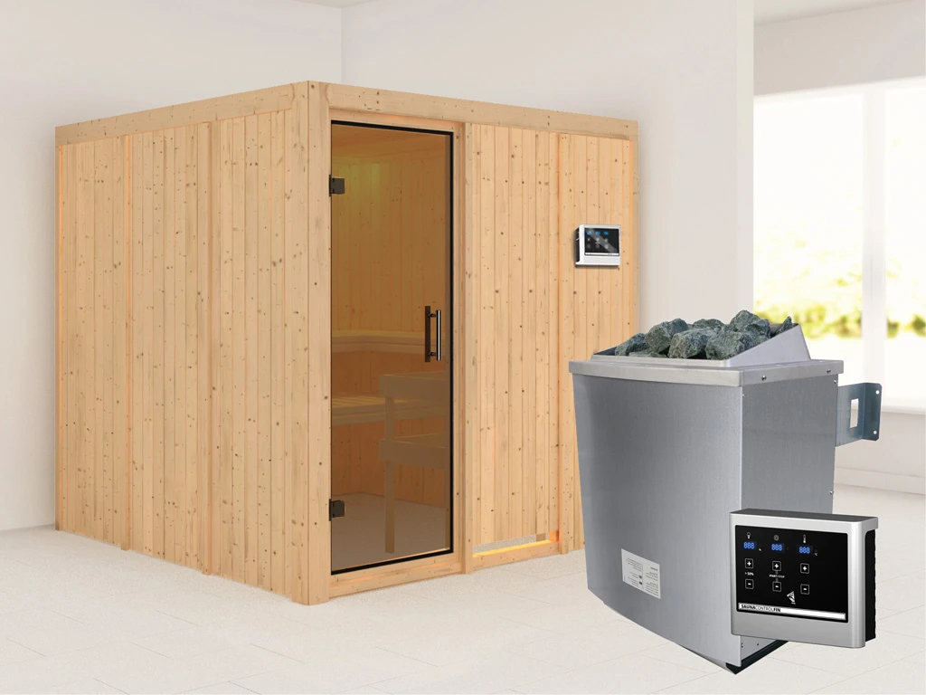 Bei dieser Innensauna ist ein Saunaofen mit einer externen Steuerung inklusive. Das Steuergerät wird außerhalb der Sauna angebracht. Auf diese Weise fängt schon vor dem Saunieren der Komfort an – mit einer bequemen Bedienung von außen und einer noch exakteren Temperatureinstellung. Weitere elektrische Geräte, wie die Kabinenbeleuchtung, können ebenso an die externe Steuerung angeschlossen und bedient werden.