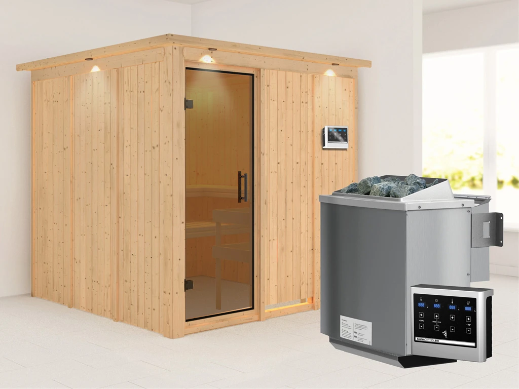 Bei dieser Innensauna ist ein Saunaofen mit einer externen Steuerung inklusive. Das Steuergerät wird außerhalb der Sauna angebracht. Auf diese Weise fängt schon vor dem Saunieren der Komfort an – mit einer bequemen Bedienung von außen und einer noch exakteren Temperatureinstellung. Weitere elektrische Geräte, wie die Kabinenbeleuchtung, können ebenso an die externe Steuerung angeschlossen und bedient werden.