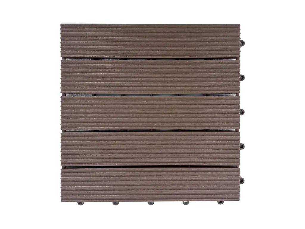 Diese 15 mm starken Terrassenfliesen werden aus Kunststoff hergestellt.