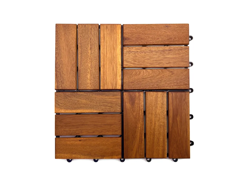 Diese 24 mm starken Terrassenfliesen werden aus Akazie hergestellt. Das gold- bis olivbraune Holz der Akazie besticht mit seiner glatten Oberfläche und der lebhaften Maserung. Als Hartholz ist die Akazie besonders unempfindlich und widerstandsfähig, sodass Witterungseinflüsse dem Holz nichts anhaben können. Mit der Dauerhaftigkeitsklasse 1–2 findet Akazienholz oft seinen Einsatz im Außenbereich. Das aus Australien stammende Holz weist aufgrund seiner hohen Elastizität zudem kaum Rissbildungen auf und verfügt über ein geringes Quell- und Schwindverhalten. Eine natürliche Resistenz gegenüber Feuchtigkeit macht das Akazienholz zu einem guten Werkstoff für den Außenbereich.