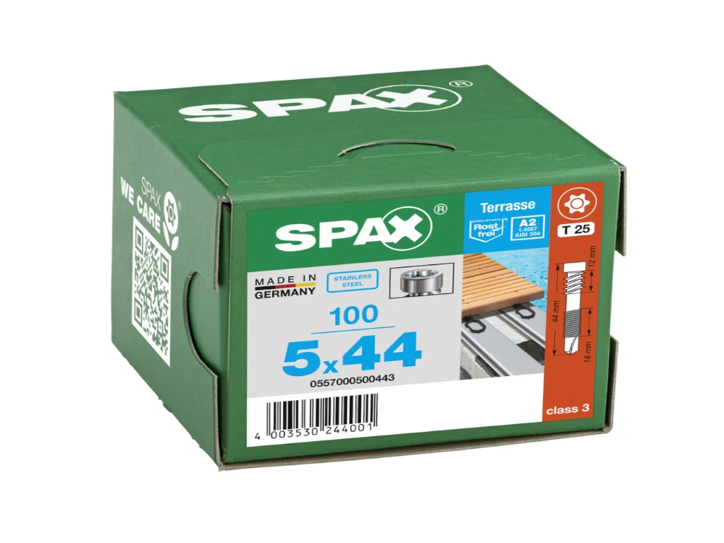 Diese speziell für Terrassendielen konzipierten Schrauben von SPAX stehen für höchste Qualität und Langlebigkeit. Gefertigt aus rostfreiem Edelstahl, gewährleisten sie eine dauerhafte und zuverlässige Verbindung deiner Terrassendielen – auch unter extremen Witterungsbedingungen. Mit 44 mm Länge und 5 mm Breite sind sie äußerst robust und bieten optimalen Halt. Das Pack enthält 100 Schrauben, sodass du genügend Material für dein Terrassenprojekt zur Hand hast. Setze auf bewährte SPAX-Qualität und genieße deine Terrasse in vollen Zügen!