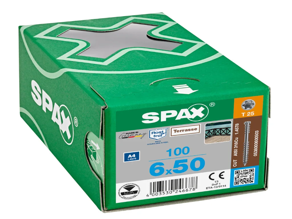 Diese speziell für Terrassendielen konzipierten Schrauben von SPAX stehen für höchste Qualität und Langlebigkeit. Gefertigt aus rostfreiem Edelstahl, gewährleisten sie eine dauerhafte und zuverlässige Verbindung deiner Terrassendielen – auch unter extremen Witterungsbedingungen. Mit 50 mm Länge und 6 mm Breite sind sie äußerst robust und bieten optimalen Halt. Das Pack enthält 100 Schrauben, sodass du genügend Material für dein Terrassenprojekt zur Hand hast. Setze auf bewährte SPAX-Qualität und genieße deine Terrasse in vollen Zügen!