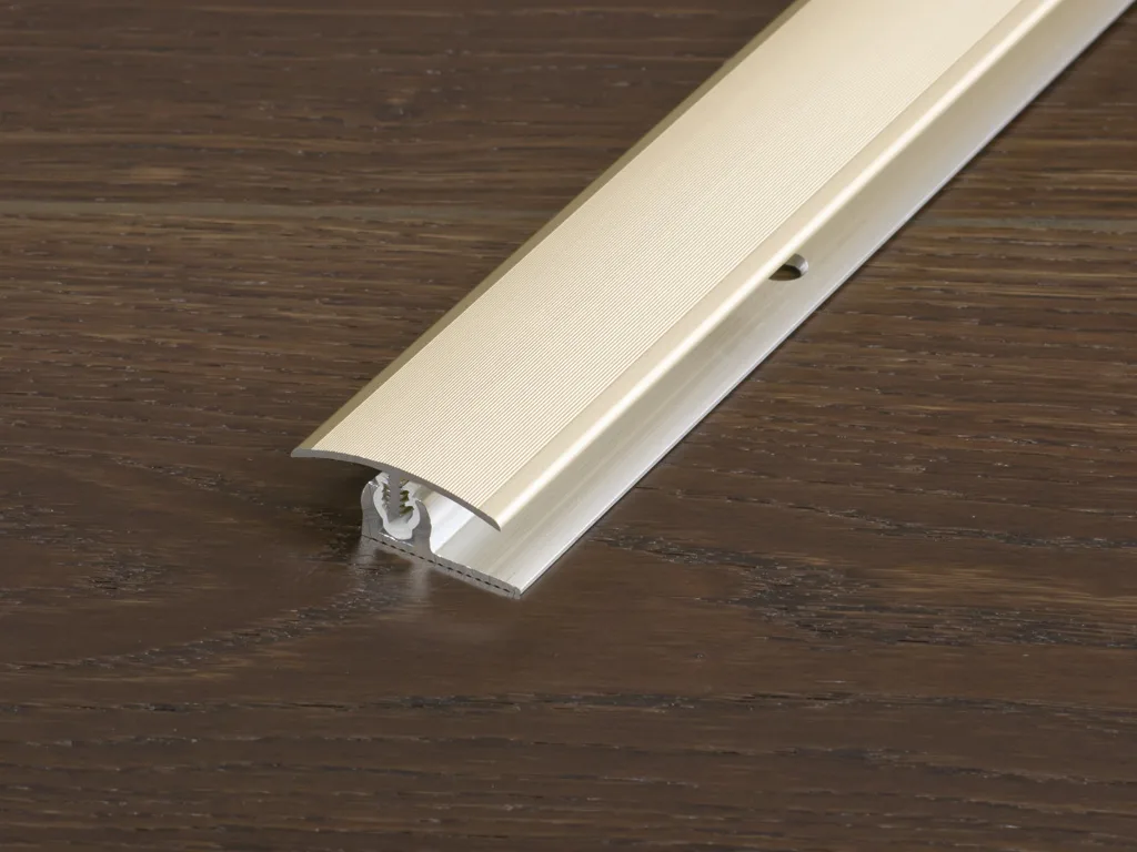 Bei den Übergangs- und Anpassungsprofilen wird das Deckprofil der zu verbindenden Bodenbeläge in das Kunststoffgelenk des Basisprofils eingerastet