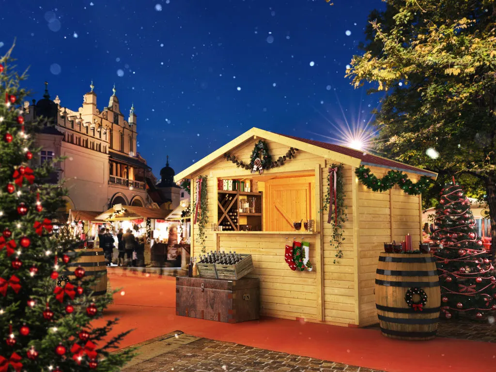 Das 6,10 m² große Verkaufshaus mit einem Wandaußenmaß (inkl. Dachüberstände) von 304 x 202 cm ist mit einem großzügigen Verkaufsfenster ausgestattet.