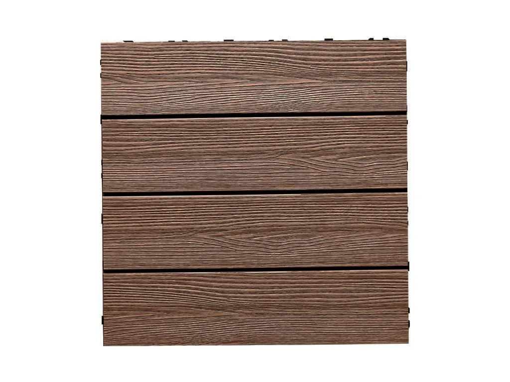 Diese 21 mm starken Terrassenfliesen werden aus WPC hergestellt. WPC (Wood Plastic Composite) ist eine Verbindung aus ca. 70 % Holz und 30 % Kunststoff mit vielen Vorteilen. Dieser Verbundwerkstoff ist nicht nur leicht zu pflegen und reinigen, sondern auch witterungsbeständig, form- und farbstabil, splitterfrei sowie rutschfest – der ideale Terrassenbelag. Außerdem zeichnet er sich durch die hohe Dichte aus, die ihn gut vor Insektenbefall schützt.