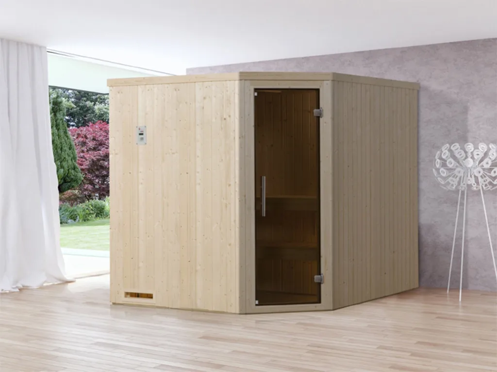Durch den praktischen Eckeinstieg ist diese Sauna auch optimal für kleine Räume geeignet.