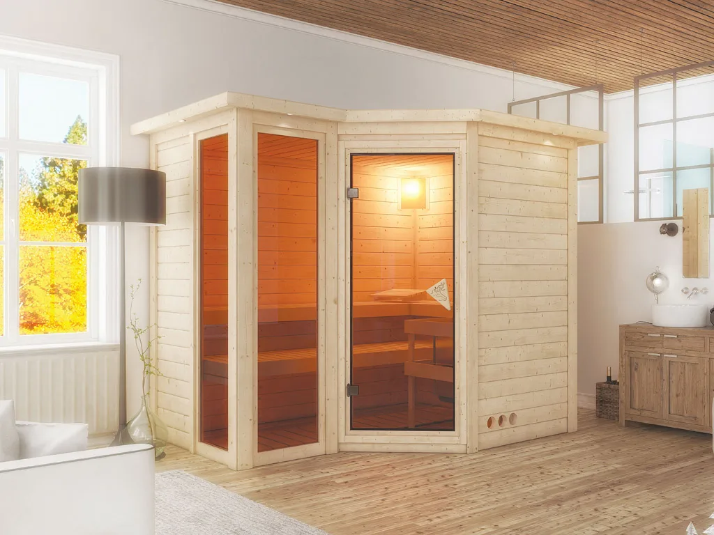 Aus 38 mm dicken Vollholz-Bohlen und einem mit Mineralwolle gedämmten und Softline-Profilholz verkleideten Dach besteht diese Massivholzsauna. Ein Steck- und Schraubsystem sorgt für schnellen und unkomplizierten Aufbau. Doppelnut und -feder Verbindungen fixieren die Sauna-Konstruktion formstabil.