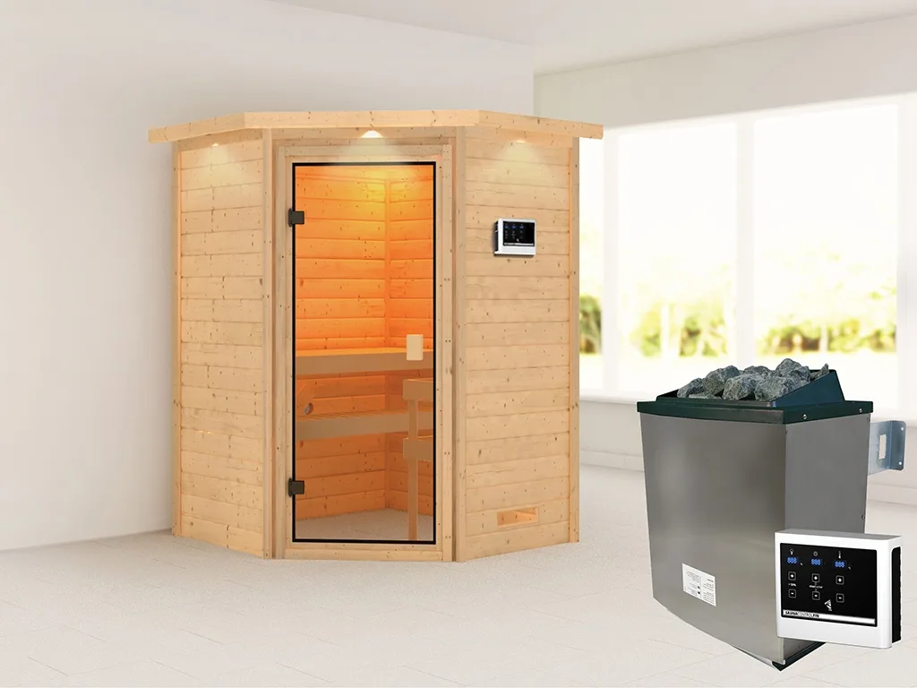 Sauna Massivholzsauna Antonia mit Dachkranz, inkl. 9 kW Ofen mit externer Steuerung