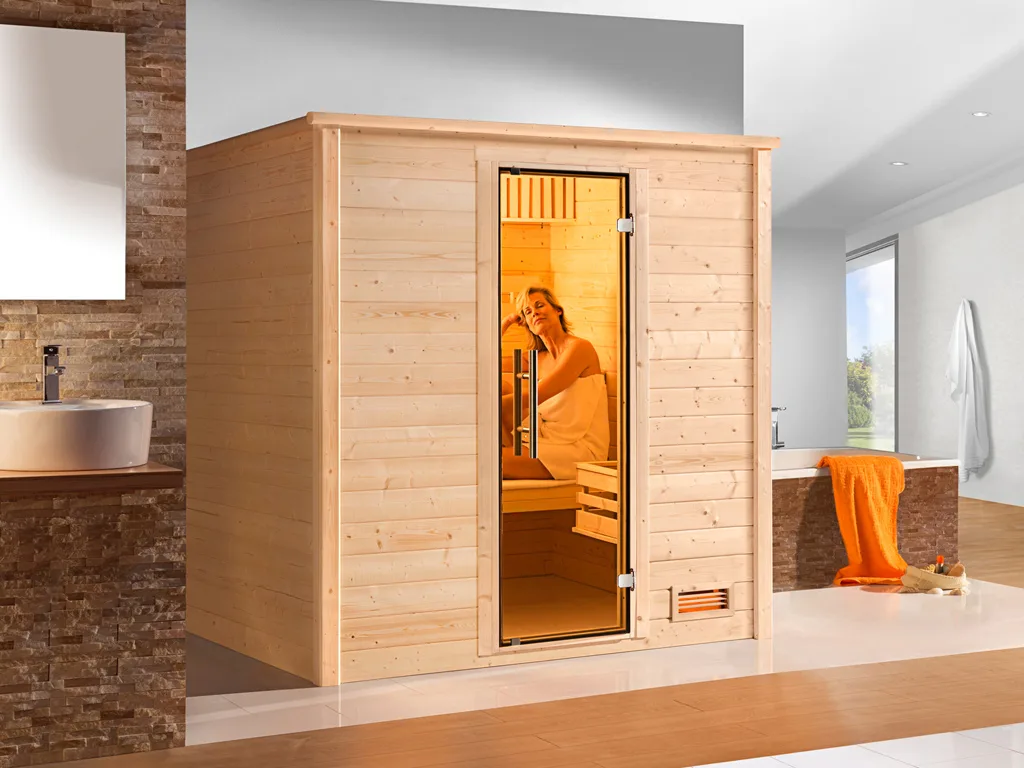 Unsere Wellnessartikel (Saunen, Saunahäuser, Saunafässer, Kotas, Infrarotkabinen, Saunaöfen etc.) dürfen nur für den privathäuslichen Gebrauch verwendet werden! Saunaöfen und dazugehörige Steuerelemente dürfen nur durch einen örtlich zugelassenen Elektroinstallateur mittels festem Anschluss an das Netz angeschlossen werden. Ausnahme: 230 Volt Plug-&-Play-Saunaöfen. Die Mindestsicherheitsabstände vom Ofen zur Wand und vom Ofen zum Ofenschutz müssen unbedingt eingehalten werden. Bei 9-kW-Öfen muss die Höhe des Ofenschutzes angepasst werden. Bitte beachte zu den obig genannten Hinweisen die beigefügten Montageanleitungen.