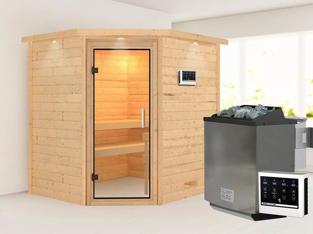 Sauna Massivholzsauna Mia mit Dachkranz, inkl. 9 kW Bio-Ofen mit externer Steuerung