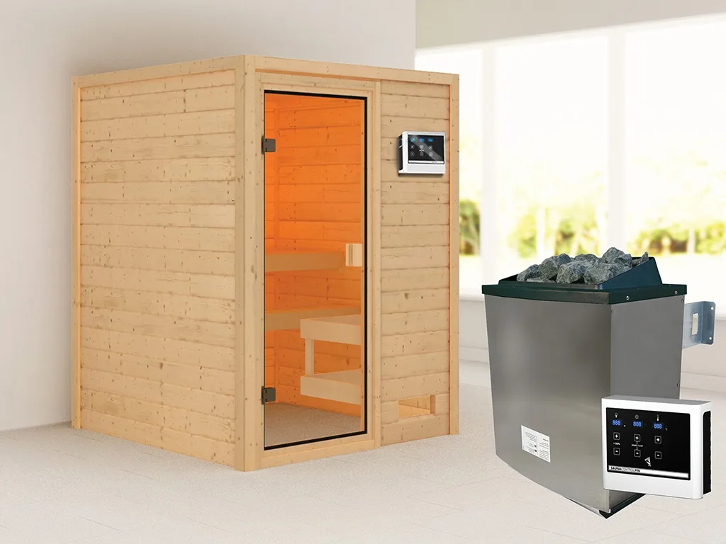 Lieferumfang: 2 Liegen, Ofenschutzgitter (Fichtenholz), 9 kW klassischer Saunaofen, Steuergerät Easy Traditionell, Beschläge & Montageanleitung