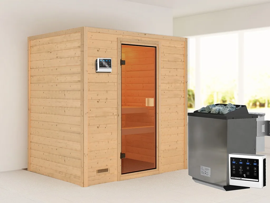 Bei dieser Innensauna ist ein Saunaofen mit einer externen Steuerung inklusive. Das Steuergerät wird außerhalb der Sauna angebracht. Auf diese Weise fängt schon vor dem Saunieren der Komfort an – mit einer bequemen Bedienung von außen und einer noch exakteren Temperatureinstellung. Weitere elektrische Geräte wie die Kabinenbeleuchtung können ebenso an die externe Steuerung angeschlossen und bedient werden. Elektronisches Steuergerät EASY Bio mit digitaler Anzeige. Für Starkstromöfen mit 3,5–9 kW Leistung. Bedienung durch leichte Berührung der Schaltsymbole. Inklusive Temperaturfühler mit Temperatursicherung und Feuchtefühler. Schaltleistung bis 11 kW. Heizbegrenzung 4 Stunden. Stufenlos zwischen 10 und 100 °C regelbar. Soll-/Ist-Temperaturanzeige in Celsius. Soll-/Ist-Feuchtigkeitsanzeige in %. Schrittweise zwischen 5 und 95 %. Anschluss für Kabinenbeleuchtung. Kabinenbeleuchtung in 10er Schritten veränderbar (10 %–100 % Lichtleistung). Anzeige Fehlerfunktion. Sicherheitstemperaturbegrenzung bei 140 °C. Alle Anzeigen auf einen Blick. 2-Sensoren-Technik. Bei Abschaltung Haltung der letzten Werte. Material: Kunststoff ABS weiß. Maße (B x H x T): 23,5 x 19,5 x 7,5 cm.