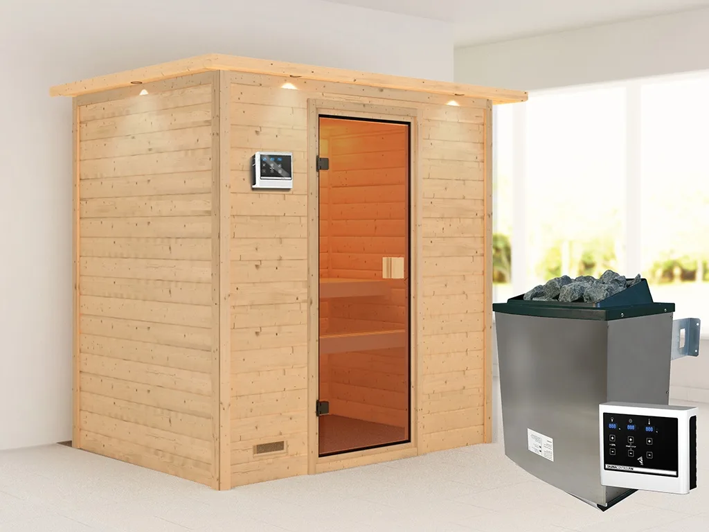 Unsere Wellnessartikel (Saunen, Saunahäuser, Saunafässer, Kotas, Infrarotkabinen, Saunaöfen etc.) dürfen nur für den privathäuslichen Gebrauch verwendet werden! Saunaöfen und dazugehörige Steuerelemente dürfen nur durch einen örtlich zugelassenen Elektroinstallateur mittels festem Anschluss an das Netz angeschlossen werden. Ausnahme: 230 Volt Plug-&-Play-Saunaöfen. Die Mindestsicherheitsabstände vom Ofen zur Wand und vom Ofen zum Ofenschutz müssen unbedingt eingehalten werden. Bei 9-kW-Öfen muss die Höhe des Ofenschutzes angepasst werden. Bitte beachte zu den obig genannten Hinweisen die beigefügten Montageanleitungen.