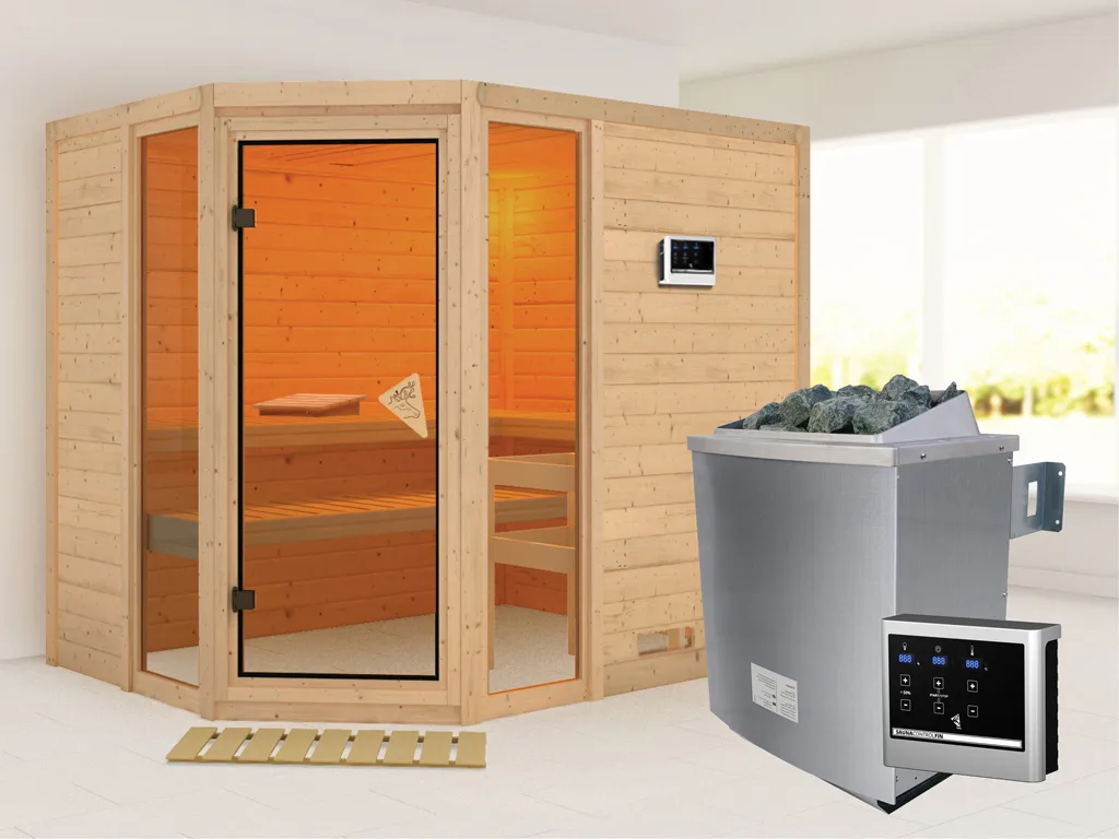 Diese Innensauna wird mit Saunaofen und einer externen Steuerung geliefert. Die Anbringung des Steuergerätes erfolgt an der Außenseite der Sauna. Ganz komfortabel kann somit die Saunasteuerung von außen erledigt und die Temperatur exakt bestimmt werden. Zusätzlich verfügt das Steuergerät über eine Anschlussstelle, über die ein weiteres elektrisches Gerät bedient werden kann.