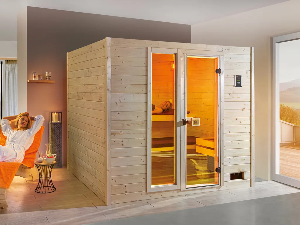 Unsere Wellnessartikel (Saunen, Saunahäuser, Saunafässer, Kotas, Infrarotkabinen, Saunaöfen etc.) dürfen nur für den privathäuslichen Gebrauch verwendet werden! Saunaöfen und dazugehörige Steuerelemente dürfen nur durch einen örtlich zugelassenen Elektroinstallateur mittels festem Anschluss an das Netz angeschlossen werden. Ausnahme: 230 Volt Plug-&-Play-Saunaöfen. Die Mindestsicherheitsabstände vom Ofen zur Wand und vom Ofen zum Ofenschutz müssen unbedingt eingehalten werden. Bei 9-kW-Öfen muss die Höhe des Ofenschutzes angepasst werden. Bitte beachte zu den obig genannten Hinweisen die beigefügten Montageanleitungen.