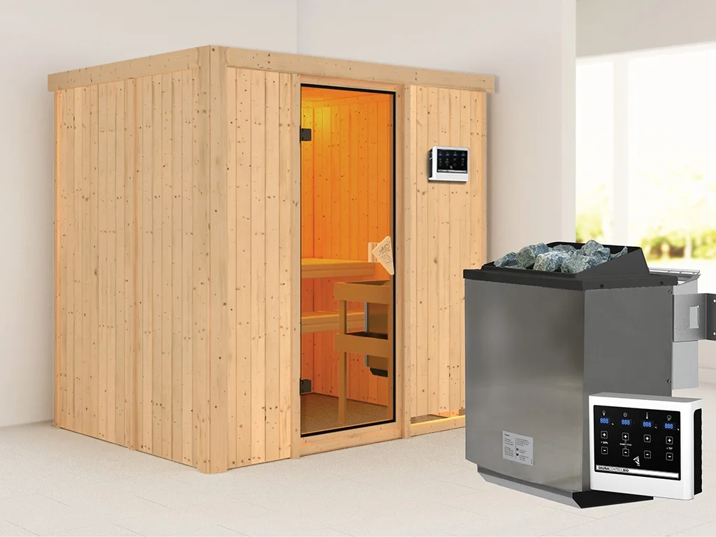 Unsere Wellnessartikel (Saunen, Saunahäuser, Saunafässer, Kotas, Infrarotkabinen, Saunaöfen etc.) dürfen nur für den privathäuslichen Gebrauch verwendet werden! Saunaöfen und dazugehörige Steuerelemente dürfen nur durch einen örtlich zugelassenen Elektroinstallateur mittels festem Anschluss an das Netz angeschlossen werden. Ausnahme: 230 Volt Plug-&-Play-Saunaöfen. Die Mindestsicherheitsabstände vom Ofen zur Wand und vom Ofen zum Ofenschutz müssen unbedingt eingehalten werden. Bei 9-kW-Öfen muss die Höhe des Ofenschutzes angepasst werden. Bitte beachte zu den obig genannten Hinweisen die beigefügten Montageanleitungen.