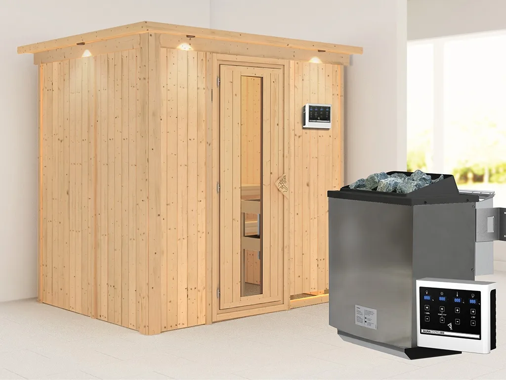 Sauna Systemsauna Bodin mit Dachkranz, inkl. 9 kW Bio-Ofen mit externer Steuerung