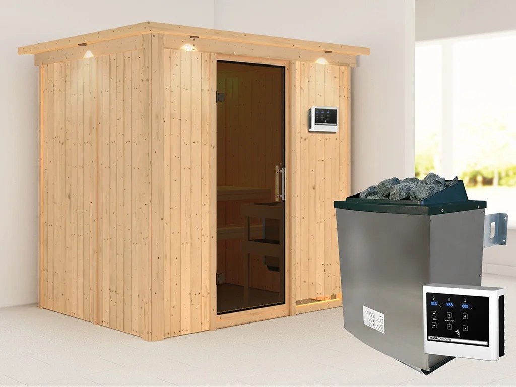 Sauna Systemsauna Bodin mit Dachkranz, inkl. 9 kW Ofen mit externer Steuerung