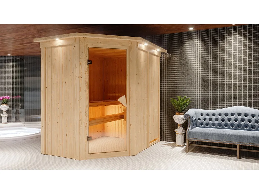 Sauna Systemsauna Carin mit Dachkranz, inkl. 9 kW Ofen mit externer Steuerung