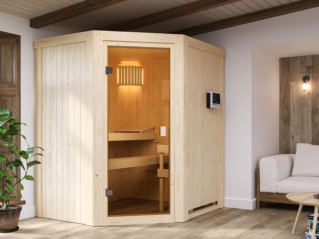 Eckeinstieg: Diese Sauna mit Eckeinstieg eignet sich besonders gut für kleine Räume. Platzsparend und kompakt passt sie in jeden Raum und nutzt die Fläche optimal.