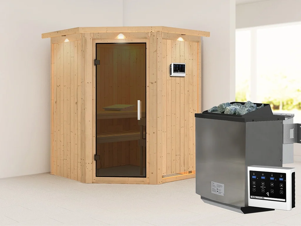Sauna Systemsauna Larin mit Dachkranz, inkl. 9 kW Bio-Ofen mit externer Steuerung