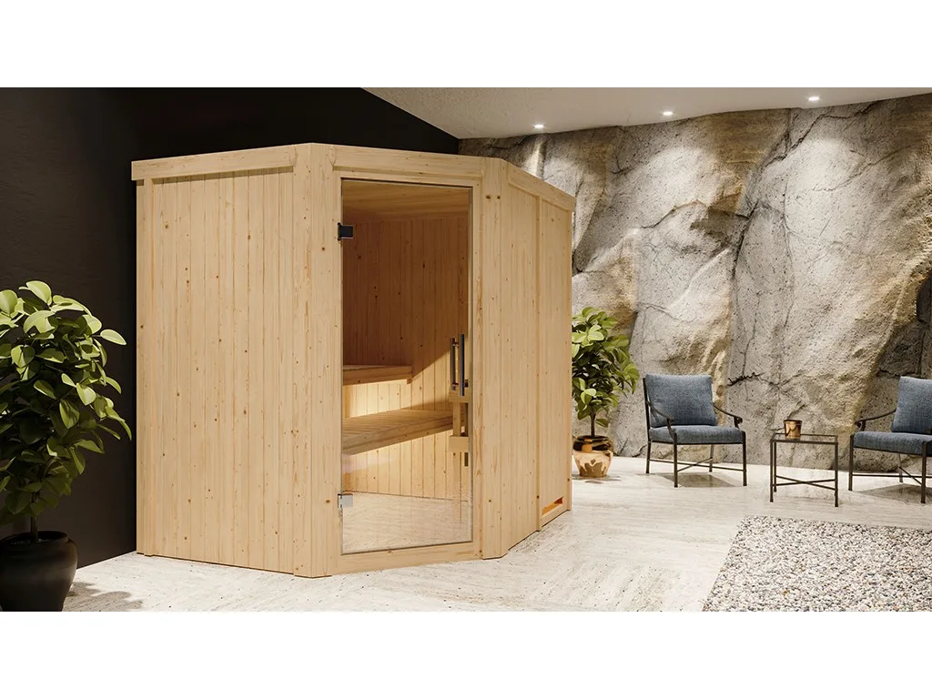Eckeinstieg: Saunen dieser Form machen sich besonders gut in kleinen Räumen, da sie platzsparend sind, aber trotzdem viel Freiheit zum Saunieren bieten. Kompakt und in nahezu jeden Raum integrierbar!