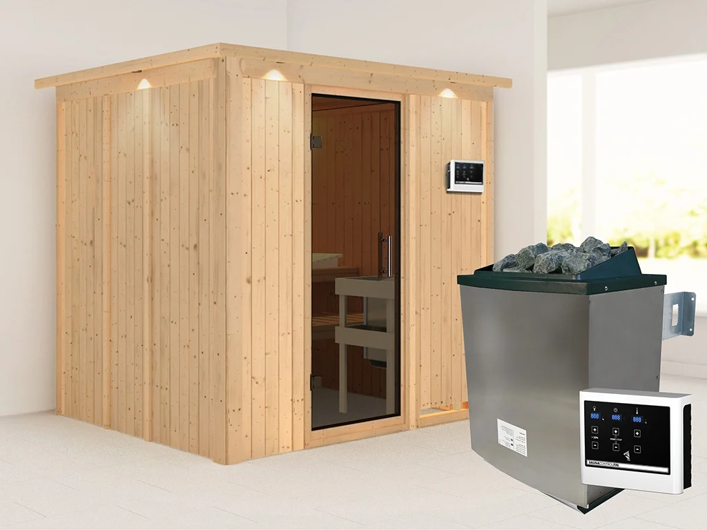 Unsere Wellnessartikel (Saunen, Saunahäuser, Saunafässer, Kotas, Infrarotkabinen, Saunaöfen etc.) dürfen nur für den privathäuslichen Gebrauch verwendet werden! Saunaöfen und dazugehörige Steuerelemente dürfen nur durch einen örtlich zugelassenen Elektroinstallateur mittels festem Anschluss an das Netz angeschlossen werden. Ausnahme: 230 Volt Plug-&-Play-Saunaöfen. Die Mindestsicherheitsabstände vom Ofen zur Wand und vom Ofen zum Ofenschutz müssen unbedingt eingehalten werden. Bei 9-kW-Öfen muss die Höhe des Ofenschutzes angepasst werden. Bitte beachte zu den obig genannten Hinweisen die beigefügten Montageanleitungen.