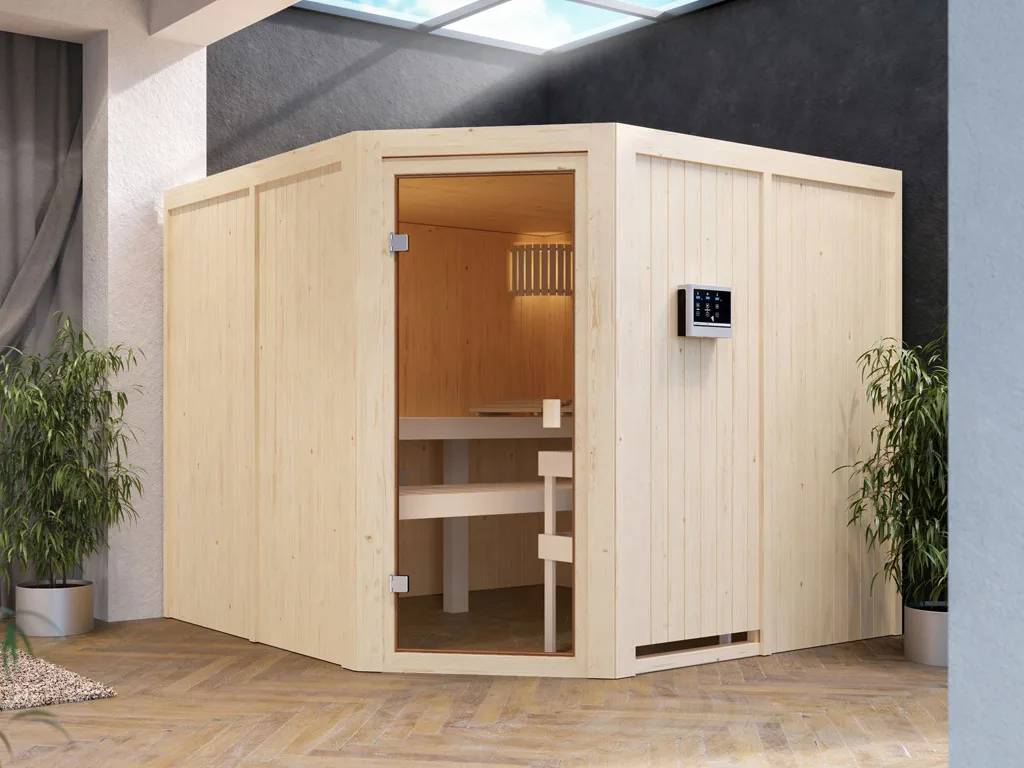 Diese Sauna wird einschließlich eines Bio-Kombiofens mit integrierter Steuerung geliefert. Am Ofen verbaut, ist die integrierte Steuerung durch Drehschalter sehr leicht zu bedienen.