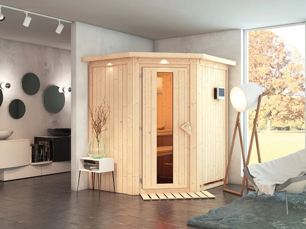 Sauna Systemsauna Taurin mit Dachkranz, inkl. 9 kW Bio-Ofen mit externer Steuerung