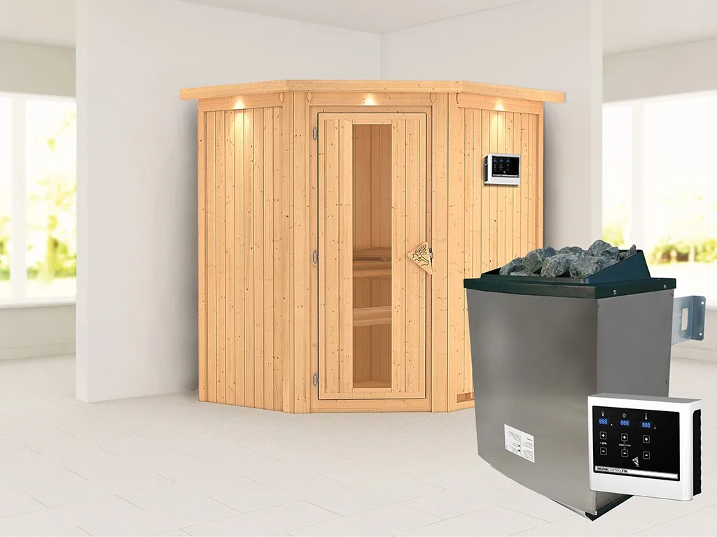 Sauna Systemsauna Taurin mit Dachkranz, inkl. 9 kW Ofen mit externer Steuerung