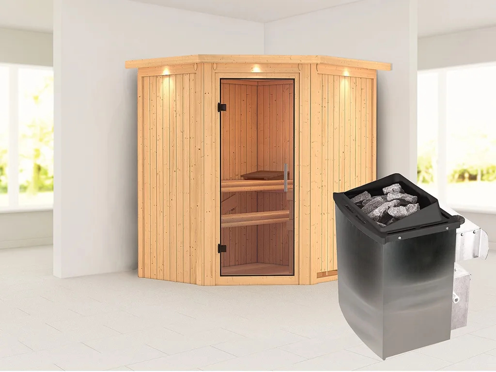 Sauna Systemsauna Taurin mit Dachkranz, inkl. 9 kW Ofen mit integrierter Steuerung