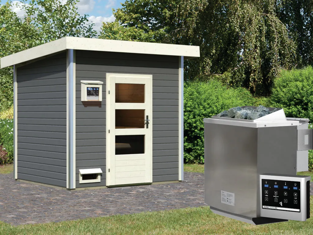 Diese Innensauna wird einschließlich Saunaofen mit externer Steuerung geliefert. Die Anbringung an der Außenseite der Sauna ermöglicht eine praktische Bedienung vor dem Saunieren und eine noch exaktere Einstellung der Temperatur. Weitere elektrische Geräte, wie eine Kabinenbeleuchtung, können ebenso an die externe Steuerung angeschlossen und mit dieser bedient werden.