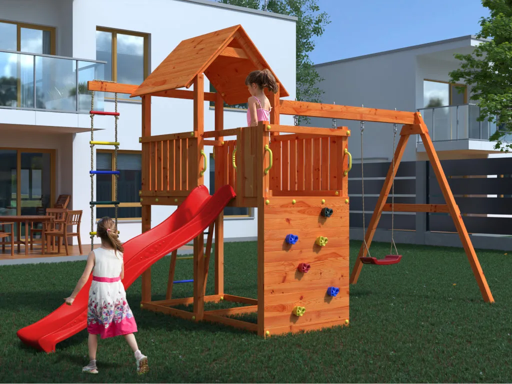 Die Podesthöhe von 117 cm ermöglicht einen tollen Blick über den Garten und die Nachbarschaft. Die zusätzlichen Erweiterungen wie Doppelschaukel, Strickleiter und Kletterwand bieten vielfältige Spielmöglichkeiten für Kinder jeden Alters.