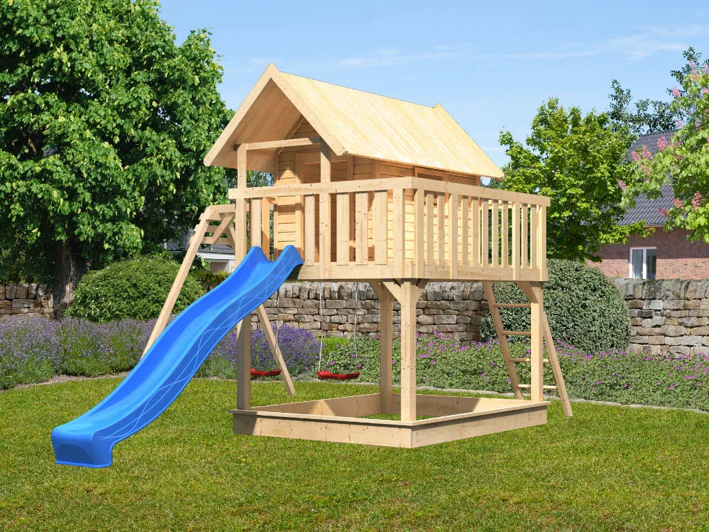 Nicht für Kinder unter 3 Jahren geeignet. Geeignet für Kinder von 3 bis 14 Jahren. Benutzung nur unter unmittelbarer Aufsicht von Erwachsenen. Stolper- und/oder Sturzgefahr. Nur für den häuslichen, privaten Bereich (DIN EN 71-8). Ausschließlich für die Verwendung im Freien. Spieltürme/Stelzenhäuser mit einer Spielhöhe von über 60 cm müssen auf einer weichen Unterlage wie Gras oder Holzspänen aufgestellt werden. Bei Spieltürmen/Stelzenhäusern mit einer Spielhöhe unter 60 cm wird eine weiche Unterlage ebenfalls empfohlen. Die Grundkonstruktion ist in regelmäßigen Abständen auf etwaige Beschädigung und Fäulnisbefall zu kontrollieren. Um die Stabilität zu gewährleisten, müssen die Pfosten im Boden verankert werden. Die Schraubverbindungen sind in regelmäßigen Abständen (ca. 4 Wochen, je nach Benutzungshäufigkeit und Alter des Spielgerätes) auf festen Sitz und Stabilität zu überprüfen. Die angegebenen Maße können geringfügig abweichen.