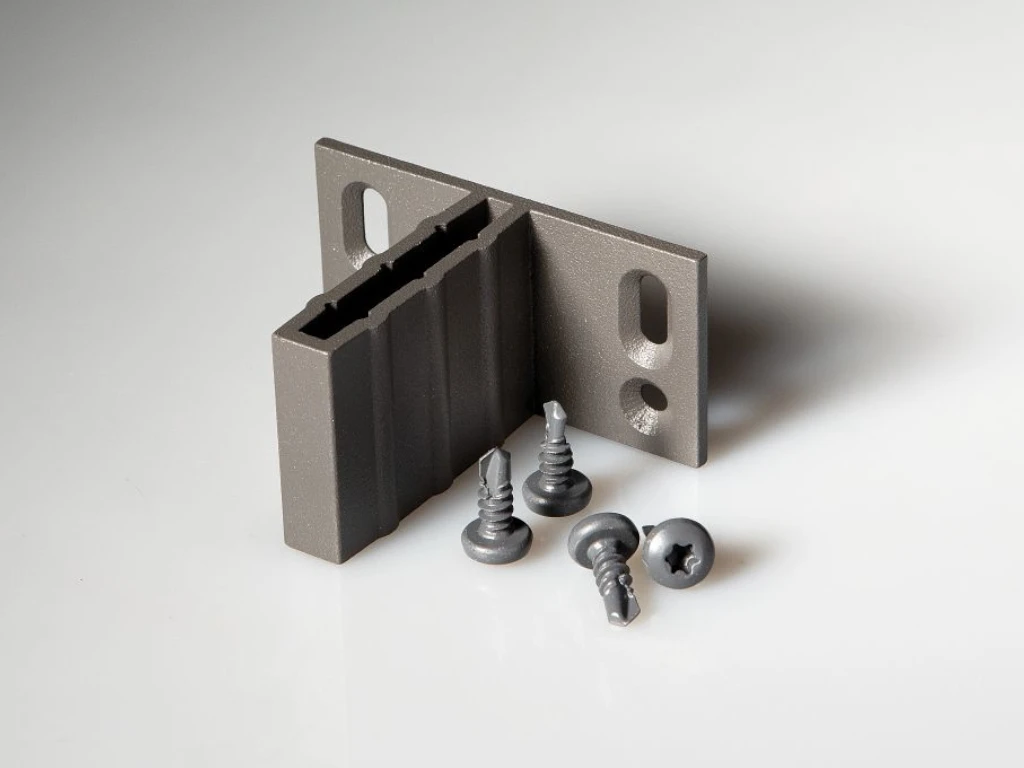Mit Verbindungswinkeln werden die WPC-Zaunelemente an den Zaunpfosten befestigt. Das Besondere an der T-Verbindung ist, dass der Halter in die Aluleiste des WPC Zaunes gesteckt und anschließend am Pfosten angeschraubt wird – diese Lösung ist elegant und kaum sichtbar. Die Schrauben aus rostfreiem Edelstahl sind im Lieferumfang enthalten.
