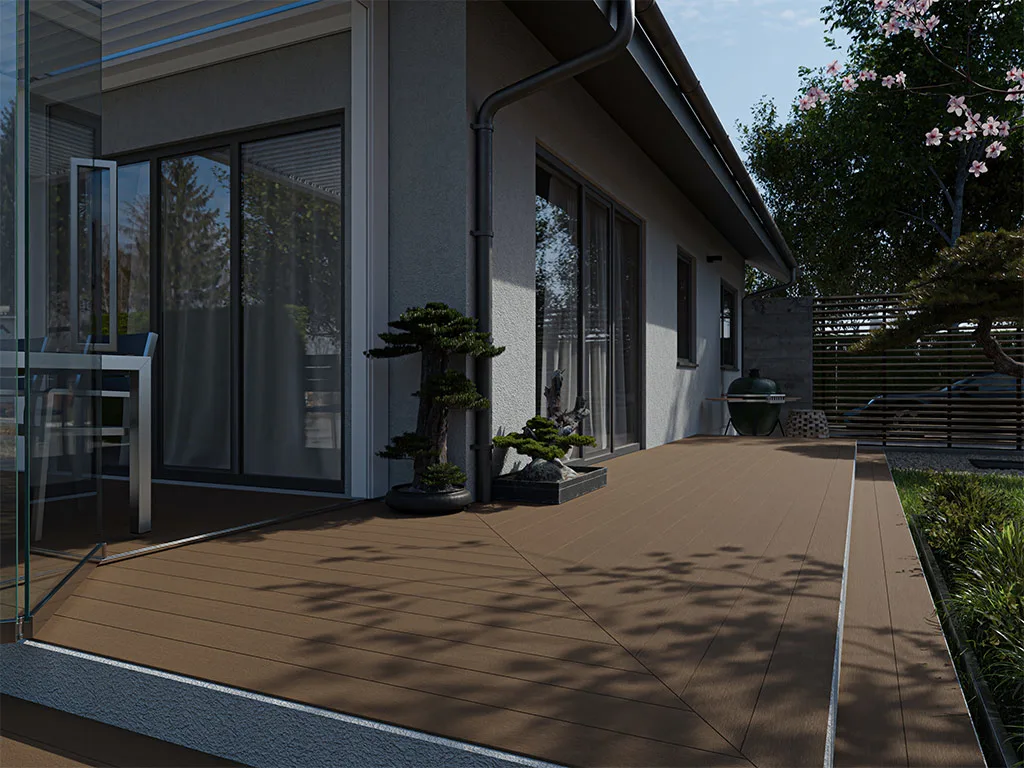Bei coextrudierten Terrassendielen wird der WPC-Kern komplett mit Kunststoff ummantelt. Dadurch wird die Beständigkeit gegen Feuchtigkeit, Schimmel und Insekten noch erhöht. Gleichzeitig sorgt das Verfahren dafür, dass die äußere Schicht länger schön bleibt.